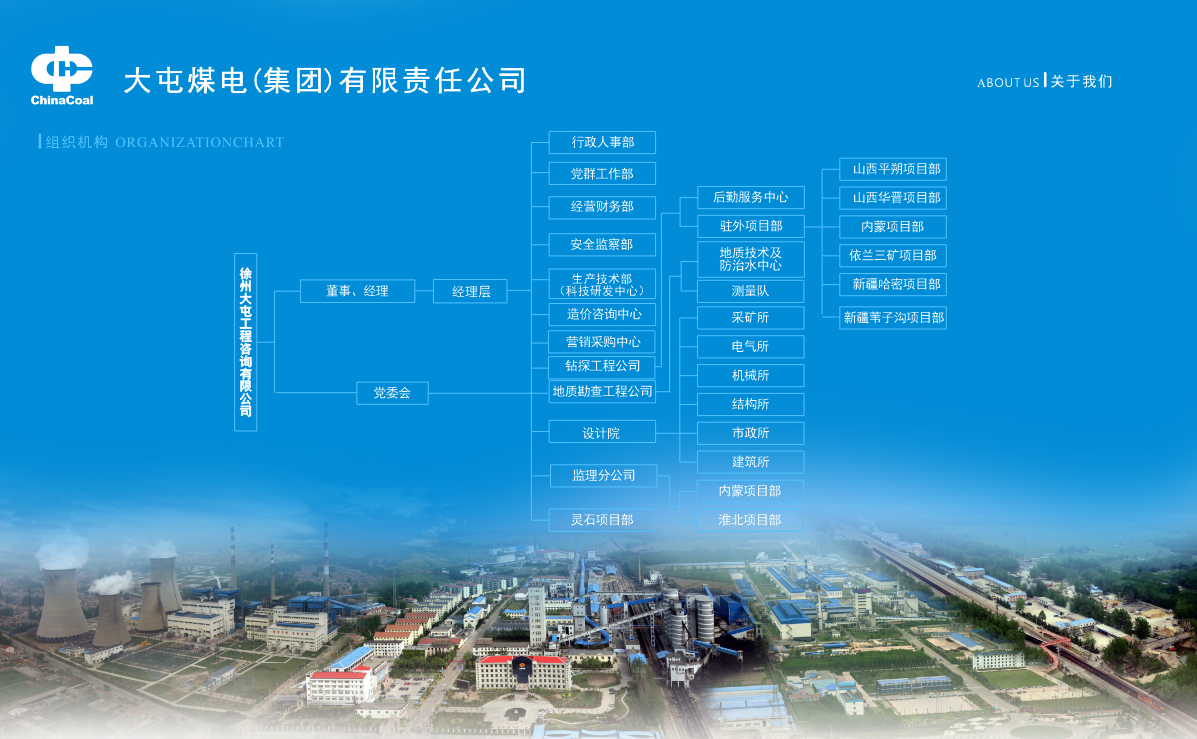 徐州大屯工程咨詢有限公司(以下簡稱“工程咨詢公司”)是中國中煤能源集團有限責任公司(以下簡稱“中國中煤”)大屯煤電(集團)有限責任公司(以下簡稱“大屯公司”)的全資子公司,成立于2005年6月,注冊資金5000萬元。主營業務包括煤礦防治水、煤礦瓦斯抽采治理、煤礦防治沖擊地壓治理、煤礦煤層注水、煤礦頂板水力致裂等地質工程鉆探業務,煤礦采掘工作面綜合物探業務,煤礦注漿治理等地質災害治理業務,煤礦地質構造探查、煤礦地面啟封孔等地質工程探查業務,煤炭行業、建筑、市政道路等工程設計,工程監理,造價咨詢,項目全過程咨詢業務。工程咨詢公司是中國中煤唯一一家擁有地質礦產勘查和地質鉆探甲級資質單位,是國家科技部認定的“高新技術企業”,是中國礦業大學“產學研”基地,也是大屯公司集地質工程勘查、地質災害治理、工程設計、工程監理、造價咨詢以及項目全過程咨詢業務于一身的綜合性技術服務型企業。工程咨詢公司在冊員工190人,大專及以上學歷人員占總人數的79%以上;下設行政人事部、黨群工作部、經營財務部、安全監察部、生產技術部(科技研發中心)5個機關科室,鉆探工程公司、地質勘查工程公司、設計院、監理分公司、造價咨詢中心、營銷采購中心6個基層單位。